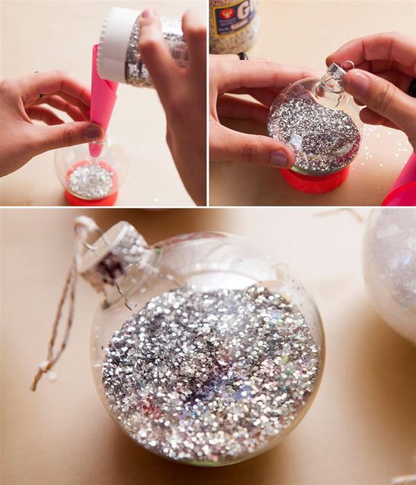 2. Ha valami különleges, saját készítésű karácsonyfadísz szeretnél, szerezz be teljesen átlátszó üveggömböket, amiket apró, csillogó flitterekkel tölts meg. Nagyon fel fogják dobni a karácsonyfád látványát.